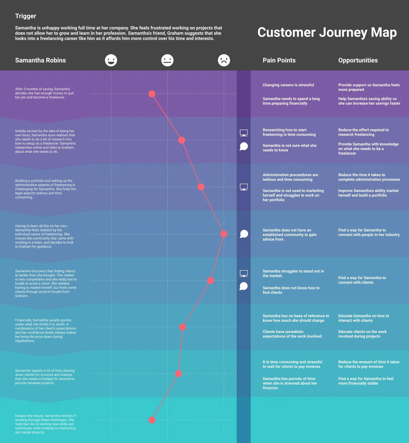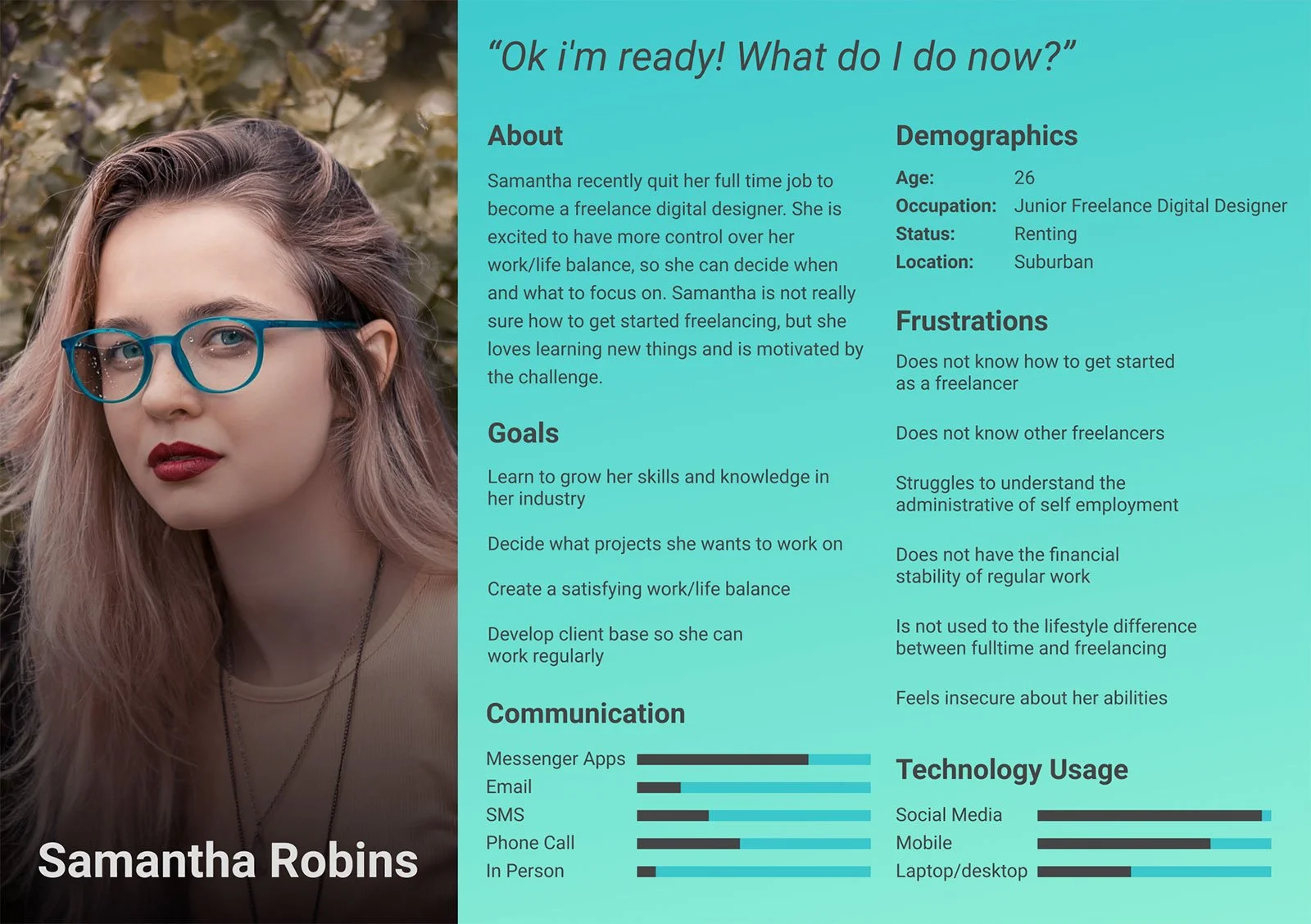 I categorised my research into two distinct freelance personas: Samantha, who is just beginning her career as a freelancer, and Graham, who has been freelancing for a few years. Despite their shared goals, their individual frustrations were distinct.