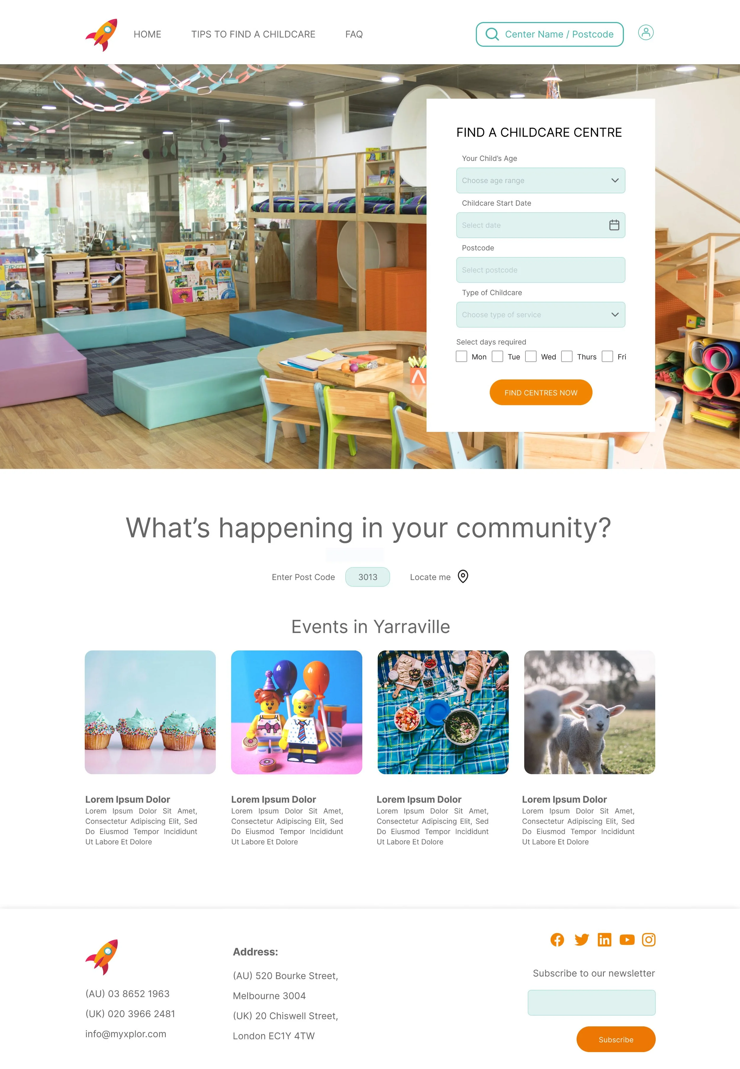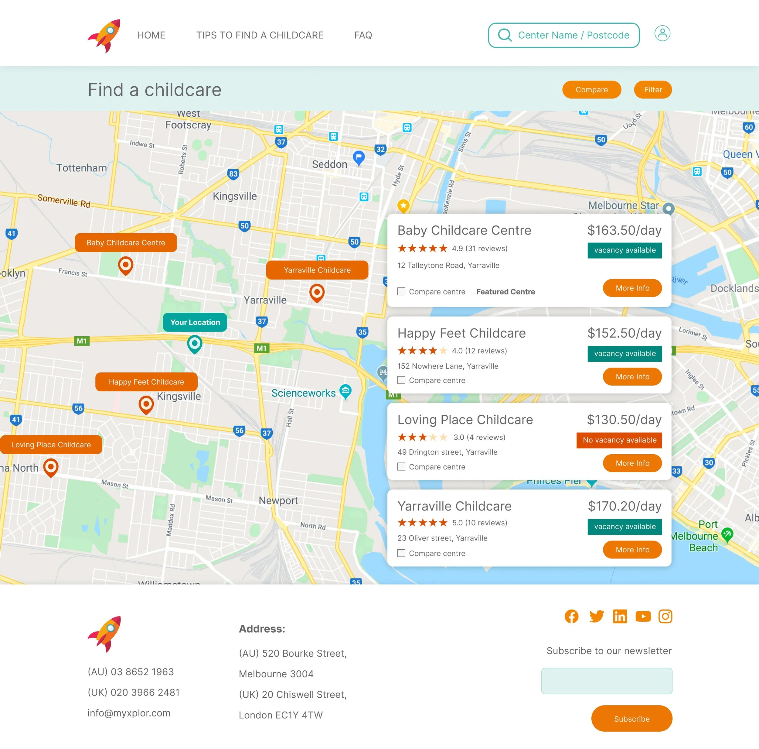 We proposed a concept solution that would enable childcare centers to create their profiles on the Xplor website and be searchable on an interactive map. These profiles would include availability and services offered, along with user ratings and staff profiles. In addition, the admin section would provide ad-building tools and a visitor booking service.