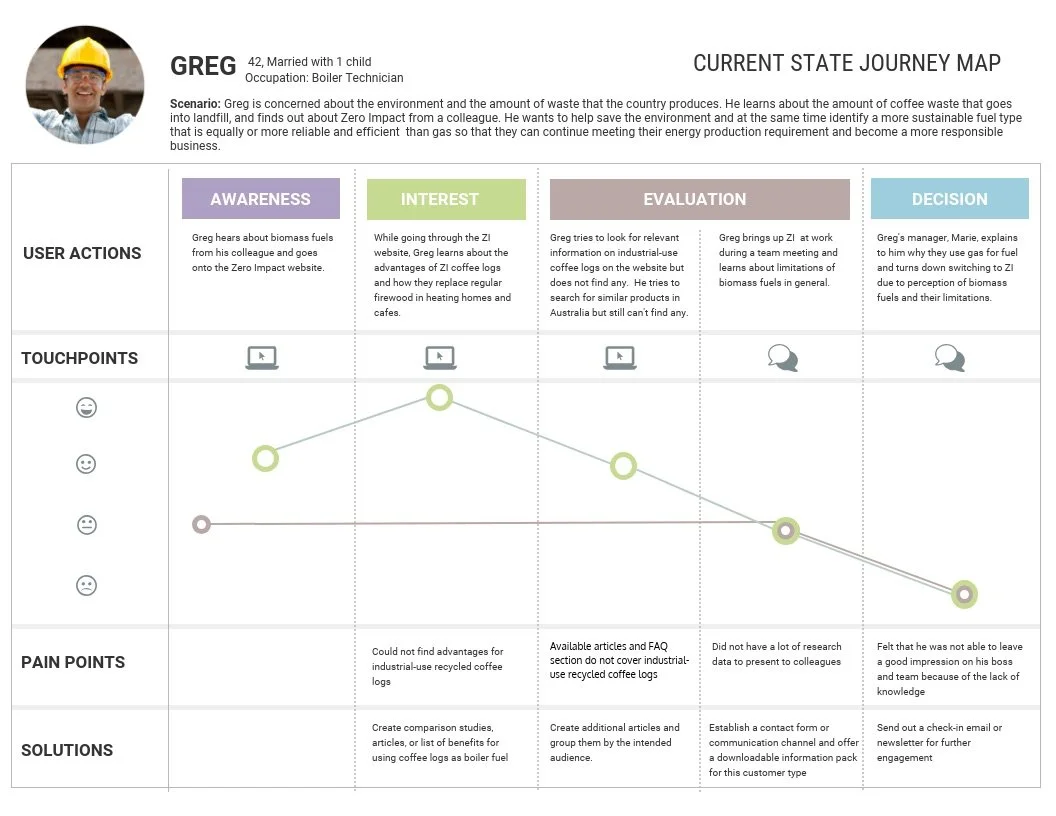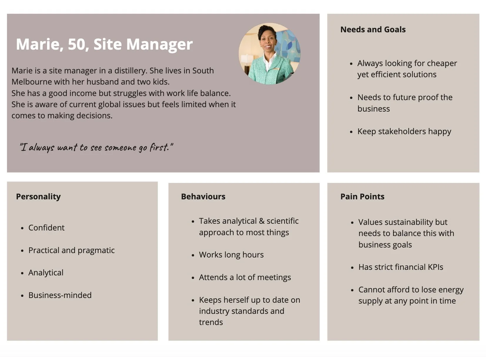 We developed personas for each customer type to define their journey experience. To represent the Boiler group, we chose a persona of a boiler technician who works with gas-powered boilers, as it is the most common type of boiler used in factories.